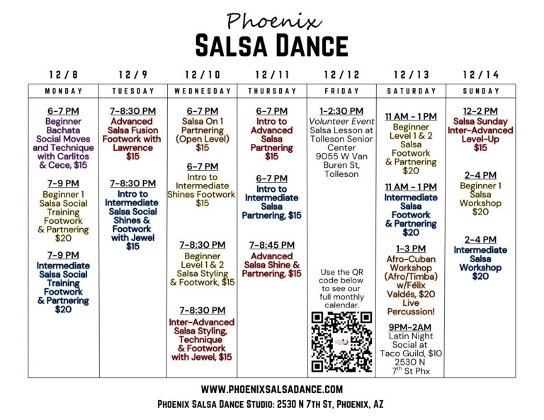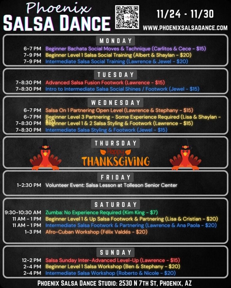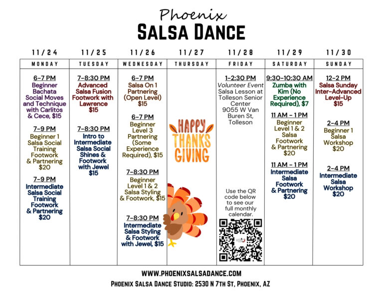 Our life’s goal is to provide people a fulfilling and fun experience through Salsa (Afro-Caribbean) dance. We have managed to assemble some of the best instructors in Phoenix to teach regular weekly Salsa classes. We offer various levels from introductory to advanced and provide monthly events so that the skills acquired can be practiced and enjoyed.