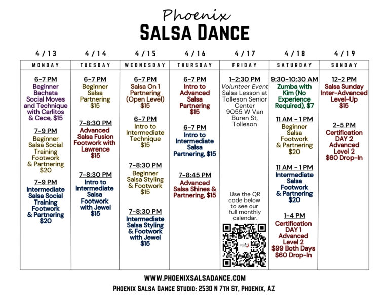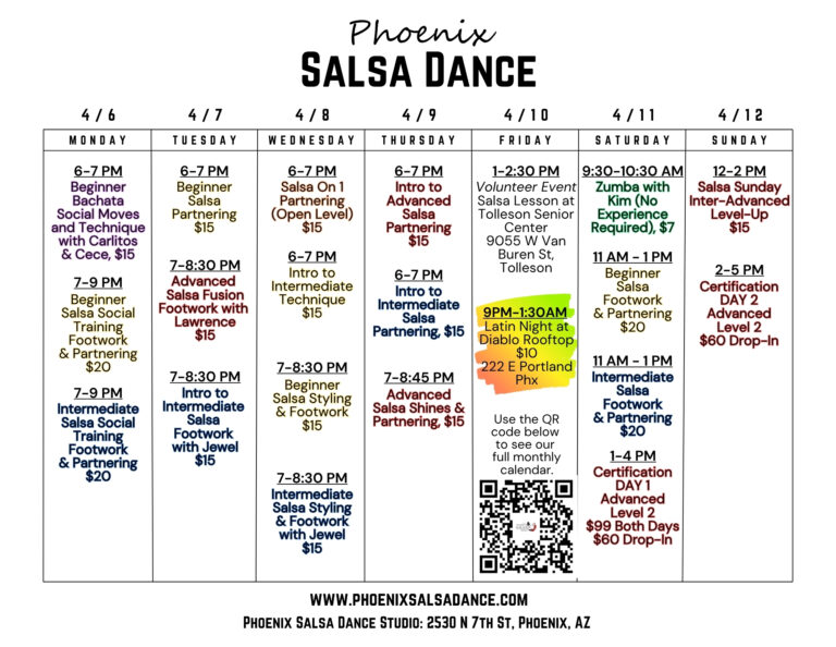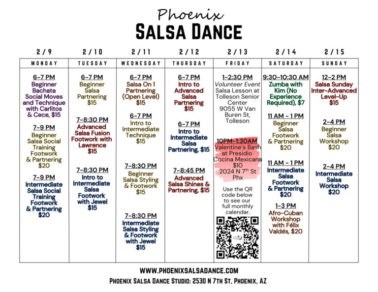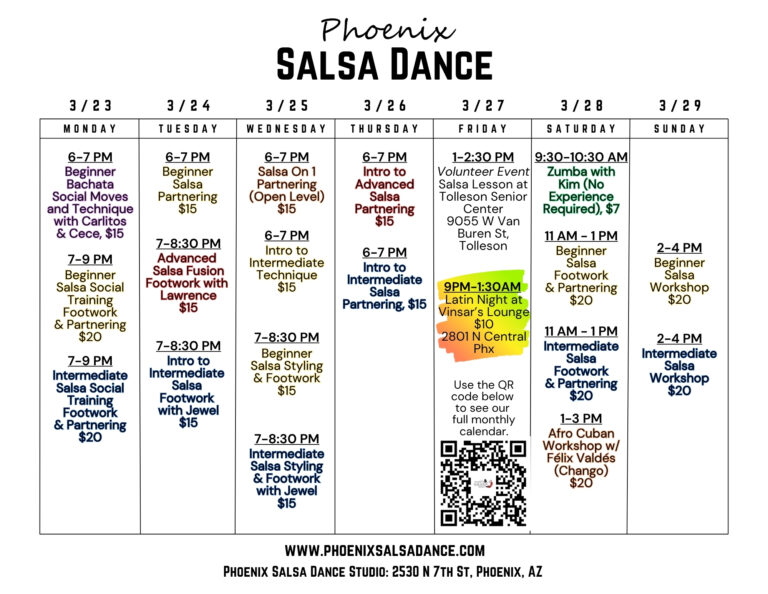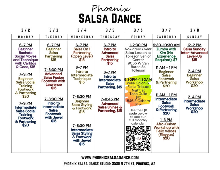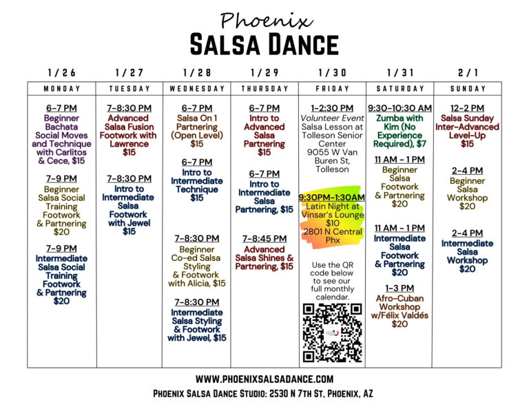 Our life’s goal is to provide people a fulfilling and fun experience through Salsa (Afro-Caribbean) dance. We have maned to assemble some of the best instructors in Phoenix to teach regular weekly Salsa classes. We offer various levels from introductory to advanced and provide monthly events so that the skills acquired can be practiced and enjoyed.
